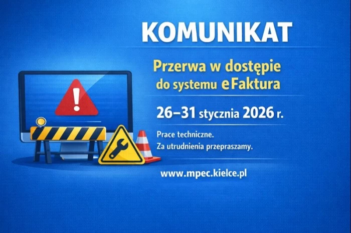 Informujemy, że w dniach 26-31 stycznia 2026 r. nastąpi planowana przerwa w działaniu systemu eFaktura, dostępnego na stronie www.mpec.kielce.pl.